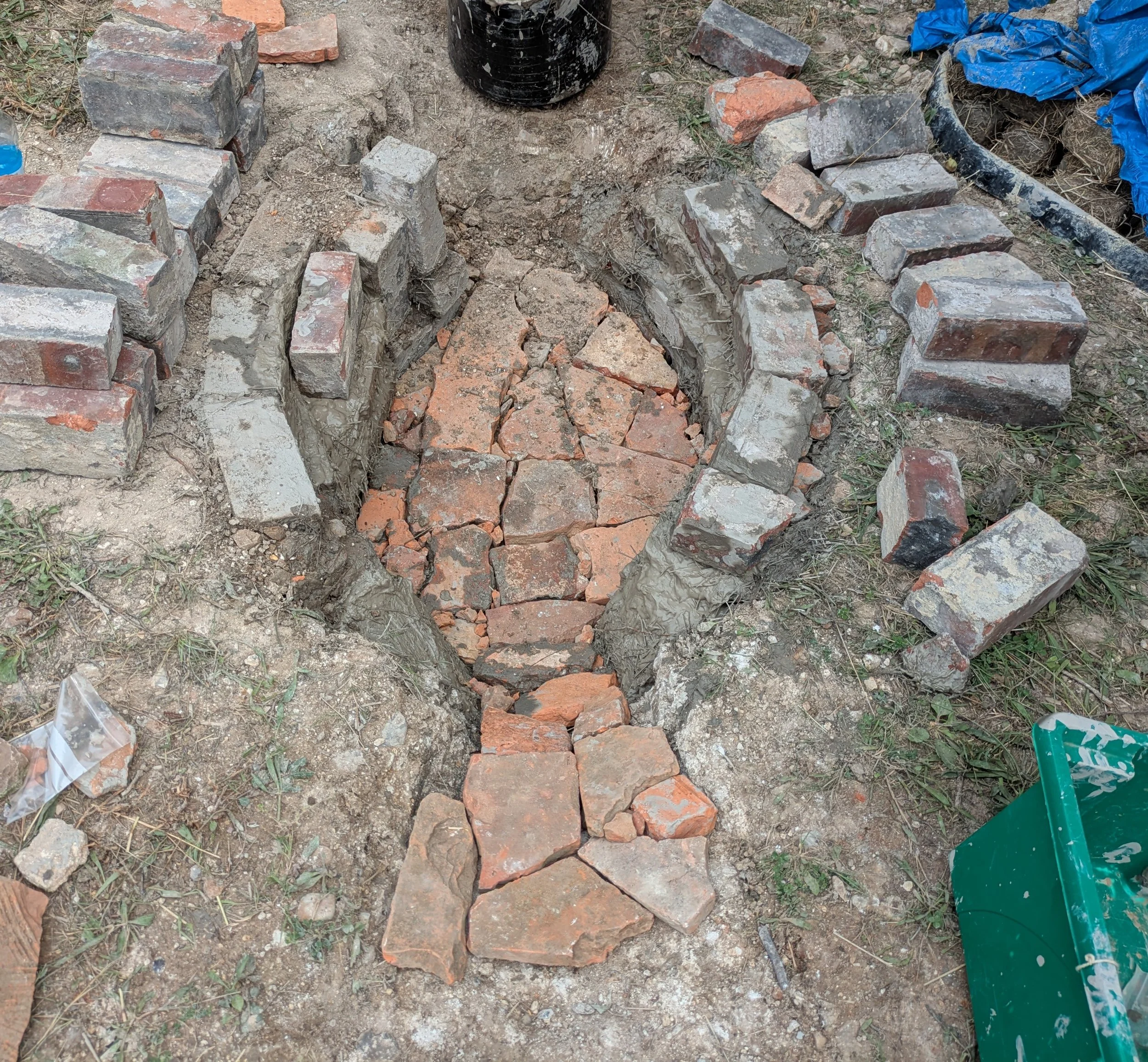 We recycled pre-fired ceramics to form a sturdy base that would need less time to dry and shrink less than daub alone. We used handmade Victorian bricks for the walls and Roman CBM for the floor. As we were on a slight slope, we felt we needed to buttress one side of the furnace, which meant the circular shape became a bit wonky. We learned to embrace the wonk just like the Romans, as most of their examples aren’t perfectly circular either! We filled in the cracks with smaller chunks of CBM and the daub paste we made earlier.
