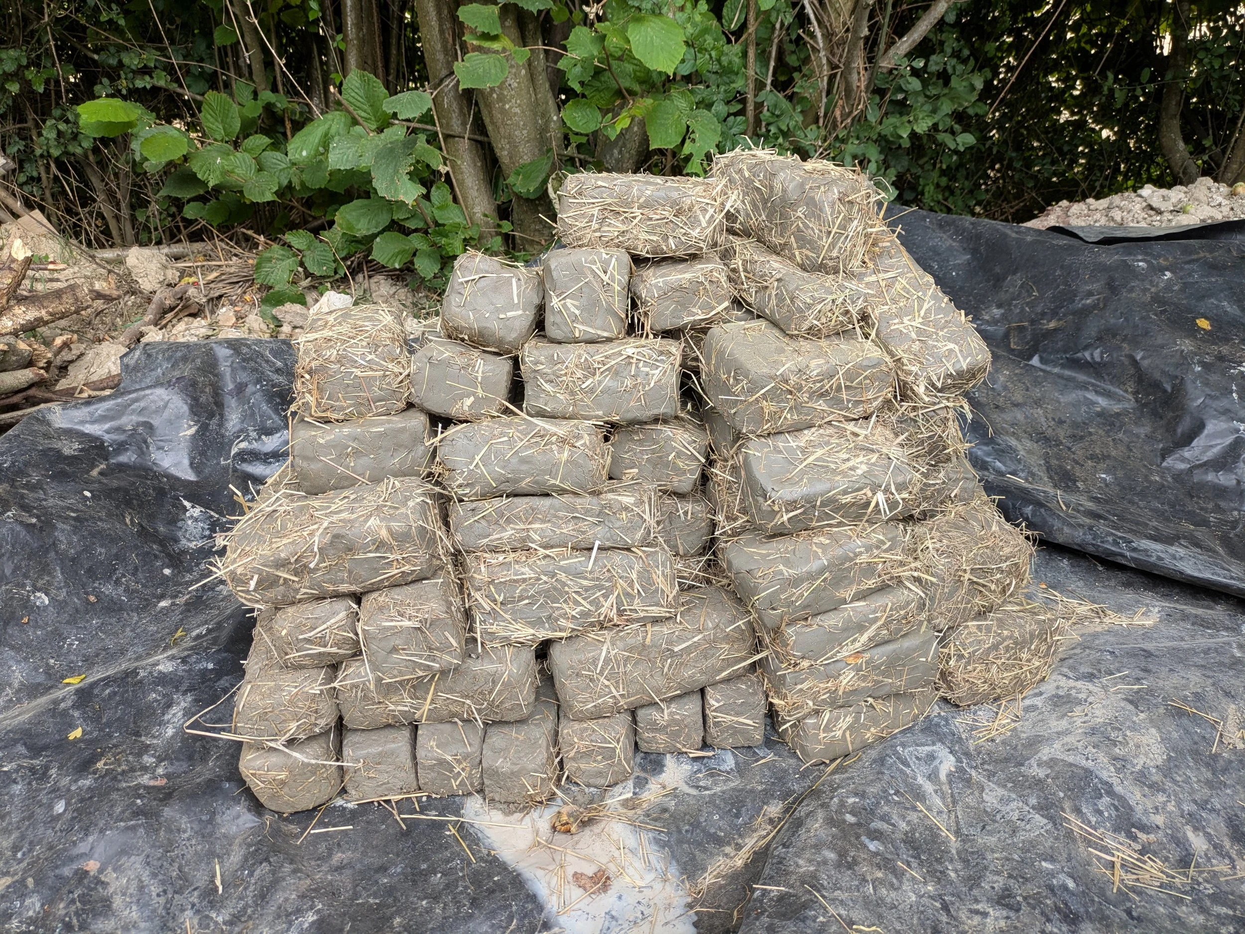 We used pre-grogged clay to save time, but we still had to work in the hay ourselves. Some of the daub was made into a paste, by adding water that could be used to fill in cracks and help glue everything together. Most of it, however, was formed into rough brick shapes that could be stacked and manipulated together as the furnace grew in height. This method also helped reduce drying time and shrinkage and made an excellent brick henge!